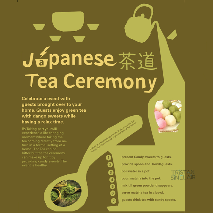 | This poster is made in Adobe indesign using color elements and image resources learned from a Japanese tea ceremony interview. The celebration is themed around mostly to drink tea. The brown background is based on the color of materials used in the preparation of tea making. the yellow color title is used to contrast from brown because it is a dark color. Then us- ing Nato Sans font to get the Kanji characters for Japanese tea ceremony. In The final stages of the poster design, using Adobe illustrator to make the typeface design to best match the theme, as well as include more green color towards the shape and font, because the type the tea used is more green tea. | ![]() |