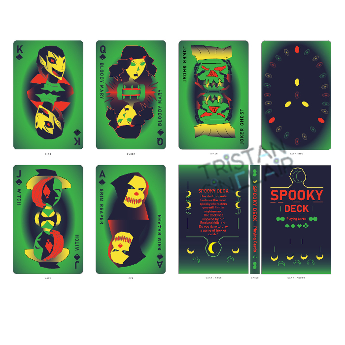 | This product design was made using Adobe indesign with the theme focus on making spooky playing cards. All characters in the deck are fantasy monsters. Vampire as king, Bloody Mary as queen, Ghost as joker, witch as jack, and grim reaper as ace. The deck is made with selective color choice to keep the spooky theme, color choices are red, green, yellow and black. | ![]() |